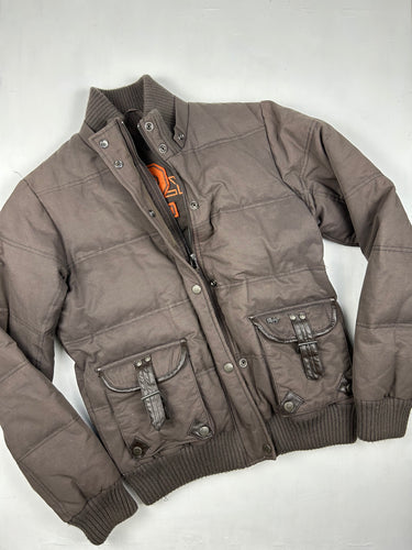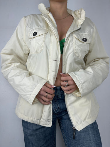 White velvet ribbed tight fit zip up hooded puffer jacket (M/L)
